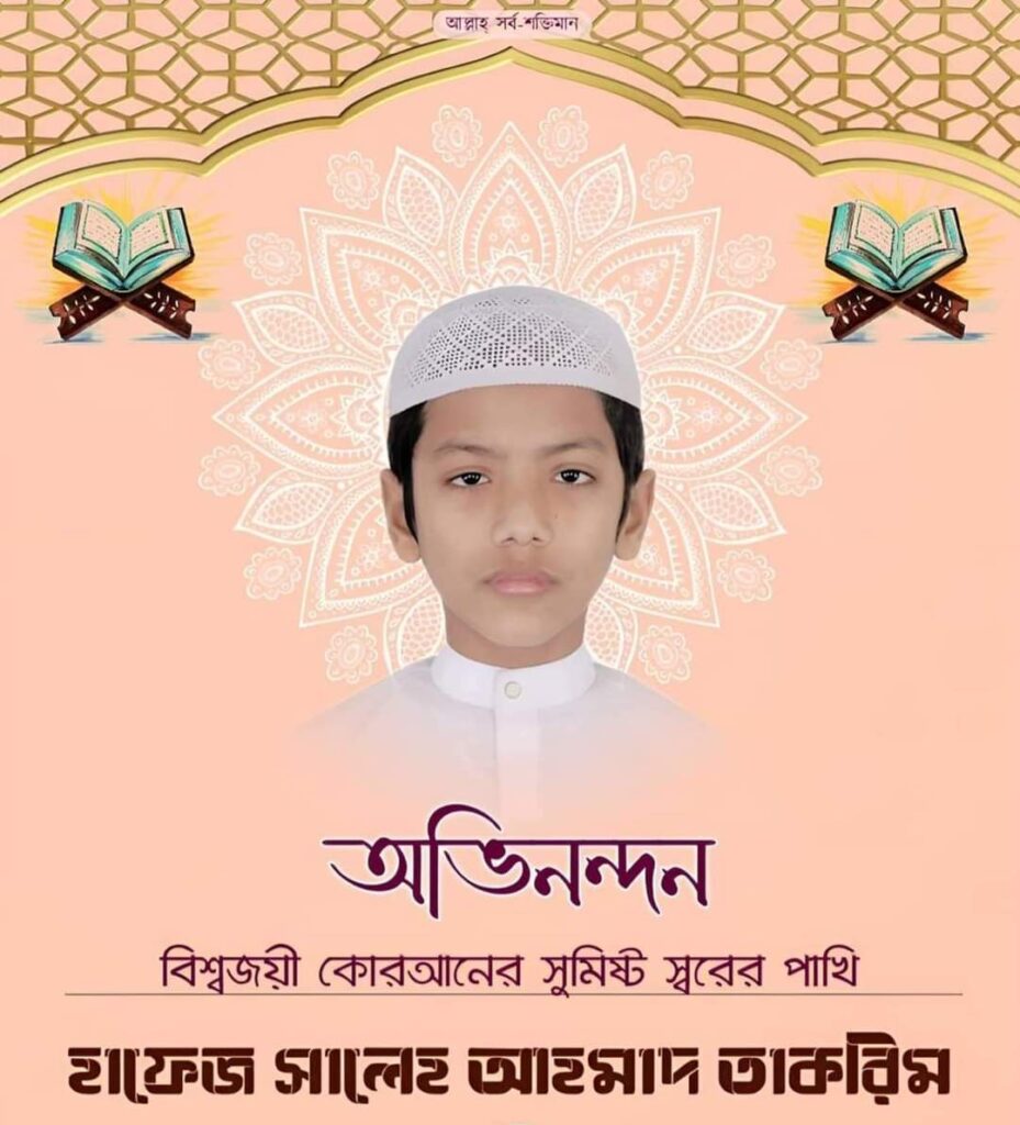 অনলাইন নিউজঃবাংলাদেশের খুদে হাফেজ সালেহ আহমদ তাকরিম মাত্র ১৩ বছর বয়সে বিশ্ব দরবার থেকে দেশের জন্য তিনটি বড় অর্জন নিয়ে এসেছেন। এরমধ্যে পবিত্র মক্কায় ৪২তম বাদশাহ আব্দুল আজিজ আন্তর্জাতিক হিফজুল কোরআন প্রতিযোগিতায় তৃতীয়, লিবিয়ায় অনুষ্ঠিত ১০ম আন্তর্জাতিক হিফজুল কোরআন প্রতিযোগিতায় সপ্তম এবং তেহরানে অনুষ্ঠিত ৩৮তম আন্তর্জাতিক হিফজুল কোরআন প্রতিযোগিতায় প্রথম স্থান অর্জন করে।