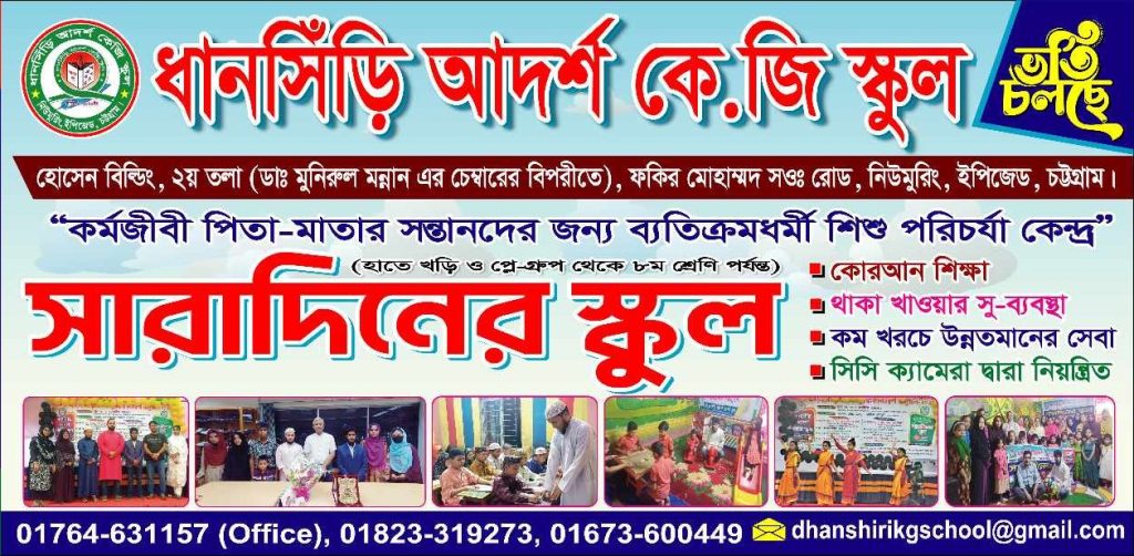 যোগাযোগঃ ধানসিঁড়ি আদর্শ কে.জি স্কুল,হোসেন বিল্ডিং, ২য় তলা, ( ডা. মুনীরুল মন্নান এর চেম্বারের বিপরীতে) মাদরাসা রোড, নিউমুরিং, ইপিজেড, চট্টগ্রাম। মোবাইলঃ ০১৭৬৪৬৩১১৫৭ অথবা ০১৮২৩৩১৯২৭৩