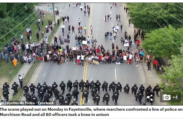 ফায়েটভিল অঞ্চলে গত সোমবার আন্দোলনকারীরা পদযাত্রা শুরু করলে পুলিশ তাদের আটকানোর চেষ্টা করে। কিন্তু তারা থামতে অপরাগতা প্রকাশ করেন। এরপর মুর্চিসন রোডে দায়িত্বে থাকা ৬০ পুলিশ সদস্য হাঁটুগেড়ে বসে পড়েন। একটি ভিডিওতে এভাবে ৩০ সেকেন্ড থাকতে দেখা যায় তাদের।
